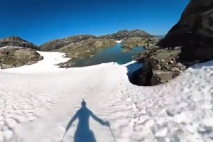 博主从雪坡急速俯冲而下,随后跃进湖中滑行近百米抵达对岸