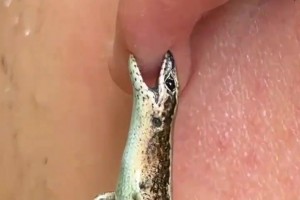 小伙展示自己的“新耳饰”,四脚蛇死死的咬着耳朵不松口!